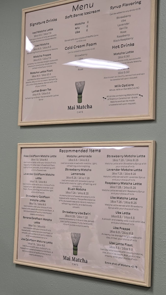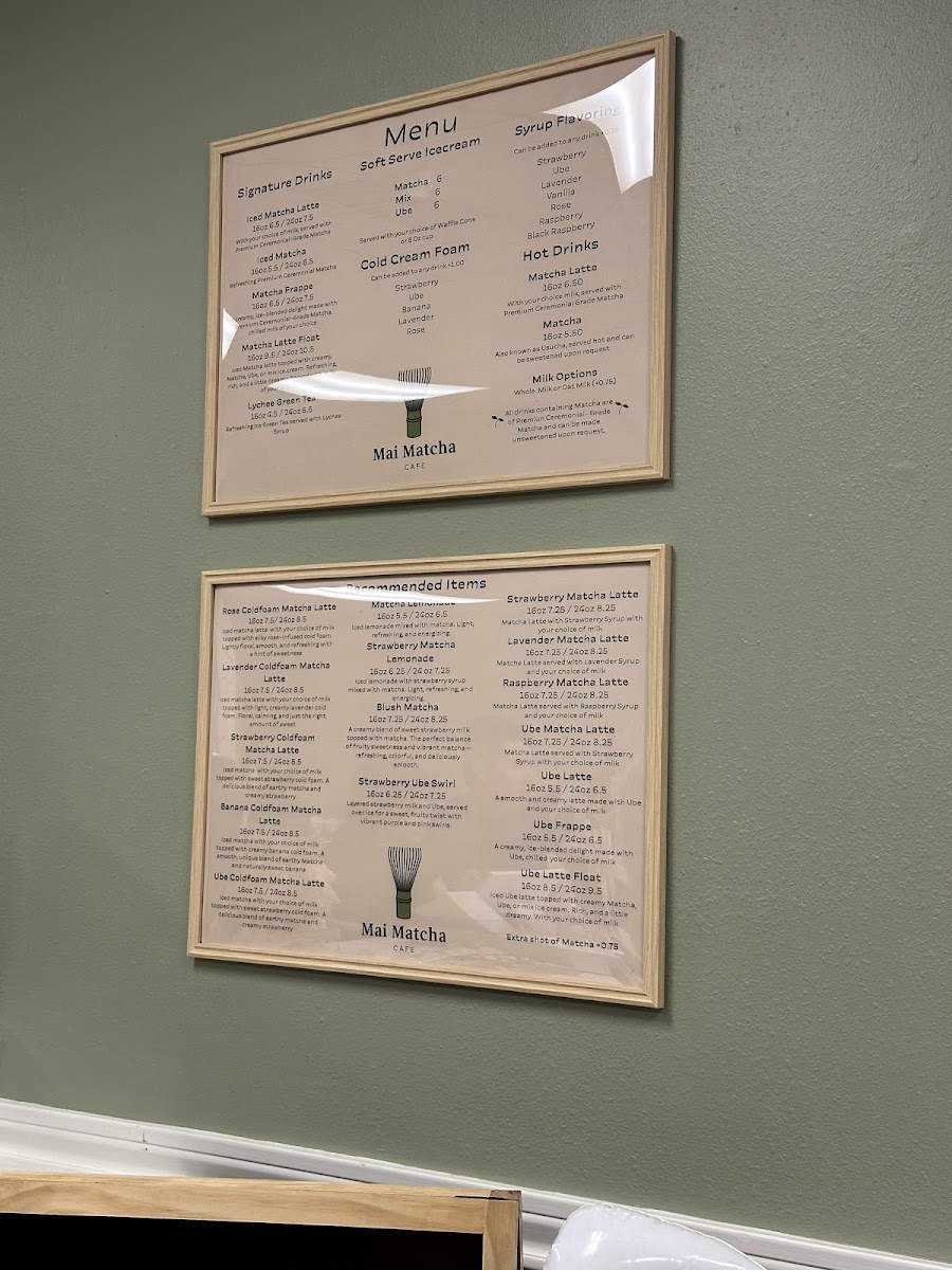 Mai Matcha Cafe in Laredo offers a unique and refreshing menu, focusing primarily on matcha and ube-inspired drinks and desserts. Their lattes range from the classic Matcha Latte to exciting variations like the Ube Latte and Strawberry Matcha Latte, each providing a smooth and rich flavor profile. For a more adventurous twist, try the Lavender Matcha Latte or Ube Matcha Latte. If you're in the mood for something icy, their frappes like the Matcha Frappe and Ube Frappe deliver a creamy, chilled experience perfect for warmer days. The cafe also serves indulgent soft serve ice cream, with options such as Matcha Soft Serve, Matcha & Ube Mix Soft Serve, and Ube Soft Serve. For those who prefer their drinks hot, the Matcha (Usucha) provides a traditional matcha experience, while the Matcha Latte offers a classic comfort. The refreshers menu features vibrant choices like the tangy Matcha Lemonade and the fruity Matcha Strawberry Lemonade, as well as the refreshing Lychee Green Tea. The floats, such as the Matcha Latte Float and Ube Latte Float, combine creamy goodness with a fizzy twist. Finally, their iced drinks like Iced Matcha and the fruity Strawberry Ube Swirl provide a cool and satisfying option for those looking to enjoy their favorite flavors in a chilled form. With such a diverse selection, Mai Matcha Cafe offers a little something for everyone, whether you're a matcha lover or seeking a sweet ube treat.